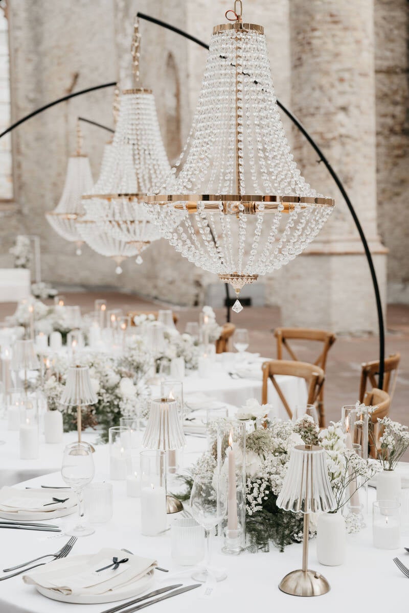 Een echte eyecatcher waren de kroonluchters boven de dinertafels. Ze brachten warmte, hoogte en dat tikkeltje luxe dat het geheel helemaal af maakte. Een trend die ik nu steeds vaker toepas.
